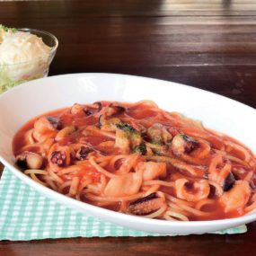 『寫眞館の珈琲』庵治の新鮮な魚介がたっぷり入ったトマト風味のスパイシーパスタを堪能