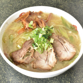 『ジャイアン』自慢の豚骨スープに魚介を混ぜた、あっさりとした美味しさ。長ネギはスープで炊いたものをトッピング。最後まで熱々で楽しめる。
