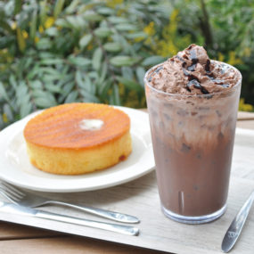 『モス&カフェ』ならではの期間限定カフェドリンクや、ふかふかとした食感の「メープルスフレケーキ(400円)」を要Check!これからの時期には爽やかな風を感じられるテラス席がおすすめ!店舗にはドライブスルーやネット注文専用窓口も併設。