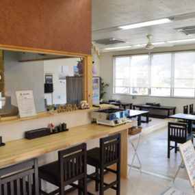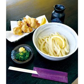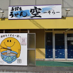 “地元の人の憩いの場になってほしい”という想いからOPENした『空』。国産小麦を独自の配合でブレンドし絶妙な力加減で打つ手打ち麺は太めのモチモチとした食感が特徴で、店主オリジナルのダシとの相性抜群。また、お子様連れのファミリーも利用しやすいように座敷席も充実。席に着いて注文する仕様なのでゆっくりと考えて注文してみては。「ぶっかけうどん(温・冷)(小・380円)」と「かしわ天(250円)」のセットが人気。天ぷらは注文されてから揚げるため、いつでもアツアツ。座敷席の他にテーブル席とカウンター席を完備。『空』オリジナルのキャラクーが目印。