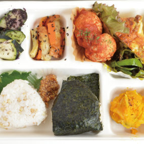 白むすびと海苔むすび入り。週替わりのおかずは、県内の旬の野業や食材などを使って手作り。