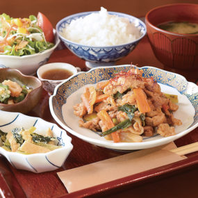 ボリュームのある週替わりのおかずに旬の野菜を使った小鉢などが付いた、バランスの良いランチメニュー。
