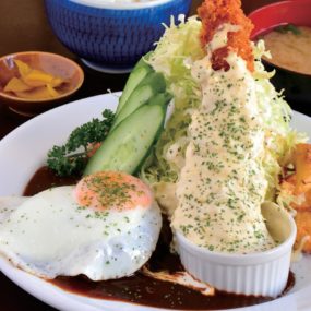 12年前のOPEN以来、”誰もががっつりお腹いっぱいになって満足してほしい”との想いを込めた、ボリューム満点の定食を昼も夜も楽しめる『スマイリー』。定食のご飯とキャベツの盛り具合は大・中・小から選べ、大を頼んでも価格は据え置きというお得感も老若男女から愛される理由の1つ。また、12月より営業時間が変更になったので訪れる際にはご注意を。