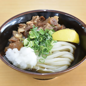 琴平に新たにOPENしたうどん店『めん舟』。麺はコシを感じつつも硬すぎない食感にこだわり、噛み心地の良い麺を目指して提供している。かけダシはいりこを効かせた昔懐かしい味で年配の方にも好評。定番メニューに加えうどんダシで炊いた牛すじをたっぷりのせた「牛すじぶっかけ」や、地鶏を使用した天ぷらなど、ここならではのメニューも並ぶ。うどん玉やダシ、天ぷらは持ち帰りも可能!