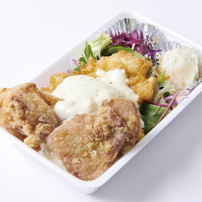 国産若鶏を100%使用した弁当を豊富に取り揃えるからあげ専門店。パサつきがちなムネ肉を醤油やにんにくなどを使用した秘伝のタレに漬け込むことでしっとりジューシーに仕上げているのがポイント。自慢の「鶏笑弁当」は、「からあげグランプリ」で最高金賞を受賞した骨なしモモ・骨なしムネの唐揚げ、チキン南蛮が全部入っていておすすめ!ご飯の大盛無料なのも嬉しい。