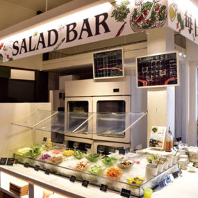 こだわりのステーキ&ハンバーグや新鮮野菜のサラダバーが楽しめる『山のや』。こだわりは肉本来の旨味を閉じ込める2度焼き!約300℃の水蒸気で蒸し焼きにすることで肉汁を閉じ込め、炭焼きで炭の香りをつけることで肉の味わいを引き立てている。リニューアルを機に、ランチタイム(11時~15時)はドリンクとデザートがセットに含まれるようになったので、ぜひ利用してみて。