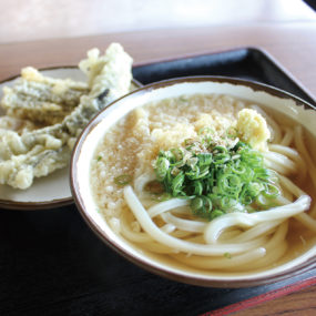 県内最東端にあるうどん店。瀬戸内海を眺めながら食べるうどんは格別!ダシに使った日高昆布を揚げた天ぷらや下味がついたゴボウなど3個で100円と手ごろな価格も魅力。