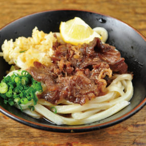 焼肉店併設の「かな山うどん」。和牛を使用した肉系うどんが人気で、約半数のお客様がオーダーするとか。足踏み手打にこだわった自慢の麺と透き通るイリコダシ、甘辛い牛肉が絶妙にマッチ。