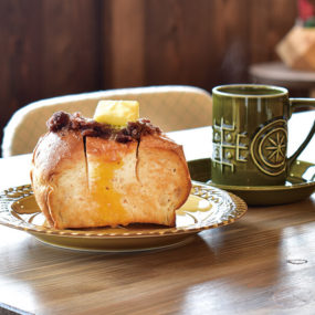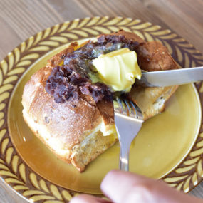玄米食パンに甘さ控えの京風あんことグラスフェッドバターをのせた一品。