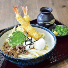 甘辛く炊いた肉と海老天、温泉卵をのせた大ボリュームの一杯。天ぷらは注文を受けてから揚げるので出来たて!