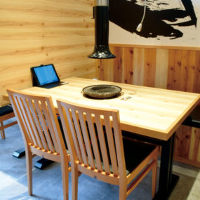 温もりのある木と半個室の空間でゆっくりと食事を楽しむことができるこちら。「まんのうひまわり牛」を中心に、その時1番美味しい食材を提供している。カウンター席も完備しているので1人での利用もGood!
