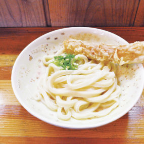 どこか懐かしさを感じる純手打ちのもっちり太麺。「しょうゆ(小200円)」は、小麦の香りが際立ち、シンプルに麺の旨さが楽しめる。天ぷらはいつでも揚げ立て熱々を提供「ちくわ(100円)」。女性でも気軽に1人で訪れやすおしゃれでゆっくりできる空間。「手ごね・手練り・足踏み」といった昔ながらの製法にこだわった純手打ちうどんが特徴。自慢の麺を堪能あれ。