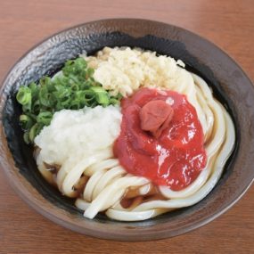 ダシのイリコの旨味をしっかりと感じられる冷やぶっかけに梅と梅肉をトッピングした、さっぱり味がやみつきになる一杯。
