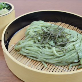 生地に栄養たっぷりの2種類のワカメを練り込んだ細麺。ほのかに香る磯の香りがクセになる、子どもにも人気のメニュー。