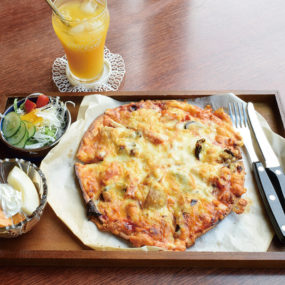 季節ごとに変わる「本日のランチ(1,000円)」は、サラダ・ミニデザート・ドリンク付き。地元の野菜を使ったピザやスパイスから手作りのホームメイドカレーが人気。「本日のデザート(600円)」はスイーツ2種とドリンク付き。手作りのプリンやブルーベリージャムがのったフレンチトーストはホッとする味わい。