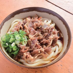 お店自慢のうどんに化学調味料不使用のダシを使用。たっぷりとのった肉はしっかり目の味付けで、食欲を掻き立てられる。
