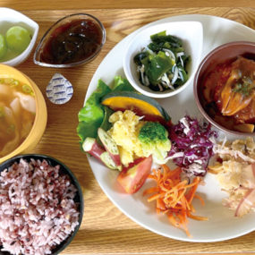 『ダイゲン自動車』に併設されたこちらは青い扉が目印。日替わりランチには二十一穀米を使用し、おかずには野菜がたっぷり!他にもグルテンフリーのスパイスカレーなど身体に優しくボリューム感もあるメニューが充実。また、モーニングタイムには自家製パンを使用したトーストやサンドイッチを提供。自家製の果実酢を使ったドリンクや、食後にピッタリのパフェもあるので、ぜひ足を運んでみて。