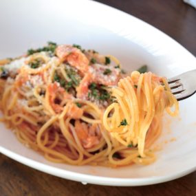 白を基調とした店内は、小ぢんまりとしながらも半個室感覚で使えるテーブル席、カジュアルに使えるカウンター席、ちょっぴりラグジュアリーな雰囲気の個室をスタンバイ。季節ごとの美味を取り入れた自慢のパスタやピザは種類も豊富で、訪れる度に新たな出会いを楽しめるのも人気の秘密。写真のトマトソースのパスタをはじめ、カルボナーラなどの冷製パスタも毎年恒例の夏のお楽しみ。