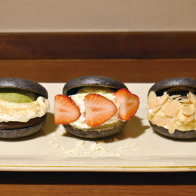 グルテンフリーで作る濃厚なチーズケーキが自慢のカフェ。大工町の店舗限定で登場しているのはサクサクの黒いモナカにアイスや生クリームなどをサンドした可愛い和風スイーツ。この機会にぜひ。