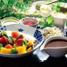 「日本料理 菊水」内に位置する隠れ家カフェ。丁寧に手入れされた美しい庭を臨む店内にはジャズが流れ、モダンで上質な時間が流れる。本格的な日本料理を気軽に味わえるランチの中でも1番人気の「月うさぎ弁当(1,200円)」は2段の重箱に詰められた料理の数々に感動間違いなし。「ぶっかけおろしそばランチ(1,200円)」やお子様向けの「子うさぎランチ」など、夏限定メニューも予定しているのでお楽しみに。