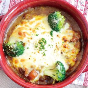 こだわりの熟成カレーは写真の「焼きカレー」の他、ディナータイムには6種類ご用意。中でも、骨付き鳥が丸々一本のった「骨付き鳥カレー(1,410円+税)」はインパクトも抜群の逸品。これからの季節は杏仁豆腐やかき氷などの夏のスイーツも充実するのでそちらもぜひ。