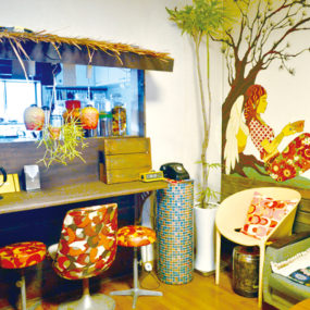 アジアンテイストを取り入れたレトロな店内は手作りのカウンターが印象的。ロゴ入りの黒電話は今も使っているそう。どこか懐かしい雰囲気の喫茶店で日替わりランチや500円均一のドリンクを楽しんで。