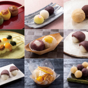 「おいでまい米粉」、「讃岐もち麦ダイシモチ」、希少糖、和三盆糖、県産のよもぎ・さつまいもなどを使用した 9種類の「さぬきの月見だんご」を味わって。販売期間は店舗によって異なるので要Check!