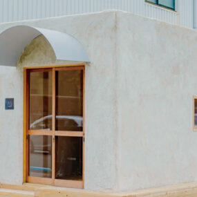 丸いひさしとコンクリートの外観が目印!扉を開ければ甘い香りに包まれた空間が。家具は店主のセレクト。『麦縄の里』敷地内の仲間たちのパンやおむすびも購入でき、ミニ麦縄の里が展開されている!