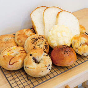店主夫婦が営むこちらでは、1日で約30種類の焼きたてパンがショーケースに並ぶ。人気の「国産小麦湯種食パン」は、モチモチでしっとりとした食感。コーヒーも販売しているので、お庭でゆっくり味わってみては。