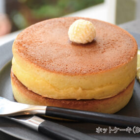 「さぬきの夢」を使用した外はカリッと、中はフワッとしたバターが香るホットケーキ。添えているレモンと白下糖シロップの組み合わせがおすすめ!