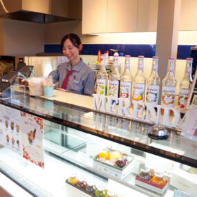 世界最高峰のソフトクリームマシーン「カルピジャーニ」を使用したソフトは空気を多く含んでいるため、滑らかで柔らかい食感。また、冷たすぎずどの年代でも食べやすいのも特徴的。1番人気の「コーヒーソフト」は併設の喫茶店『珈匠』の豆から挽いて作ったほろ苦い自家製コーヒーゼリーにソフトの甘みがマッチ。トッピングのコーヒー豆の粉や砕いたクッキーもいいアクセントに。細部までこだわった逸品をぜひ召し上がれ。