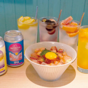 水色の壁が映える店内で、昼は日替わりランチ、夜は創作料理を愉しめる。「何を食べるかより、誰と食べるのかを大切にしてほしい」と話す店主・管東さん。お客様同士でお酒のシェアも可能なので、新たな出会いが生まれるかも…?