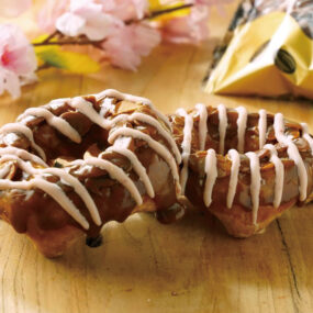 フレッシュバターを折り込んだパイに香ばしいローストアーモンドを合わせ、リング状に焼き上げた「桜チョコ キャラメリゼリングパイ」。さらに、春限定の桜チョコを上掛けしました。