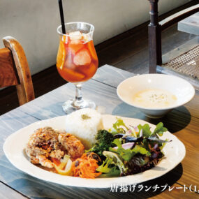 写真は、本日のMENUの「フルーツティー(セット・550円、単品・650円)」を追加。食事に+300円でソフトドリンクの追加も可能。