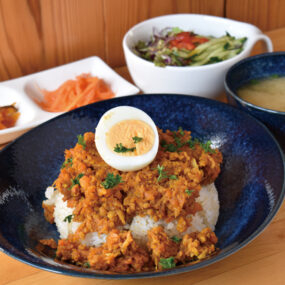 「食事が身体を作り、健康面でも大切なことを伝えたい」と店主。無添加調味料、愛媛の『さんなべきりやま山たまご』、三豊の無農薬の玄米や野菜を使った料理を提供。メインに肉と魚が交互で登場する「週替わり定食」が人気。