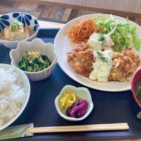 全ての料理を手作りにこだわり、できたての料理を提供するお店。10時半から楽しめる「日替わり定食」には、メインのおかずに小鉢2品とドリンクが付いていてボリューム満点。チキン南蛮には自家製タルタルソース、ローストチキンには自家製のゆず醤油ソースと手作りソースが掛かっていて、日替わりのおかずを引き立てる。随時メニューも増えていく予定なのでお楽しみに。
