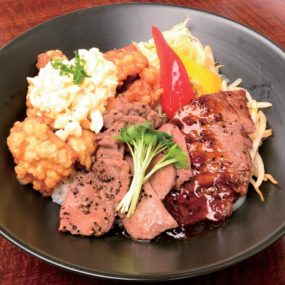 牛ステーキ、牛タン、チキン南蛮、ハンバーグなど、7種からお好きな3種を選べるスペシャル丼。ご飯は特盛まで無料!