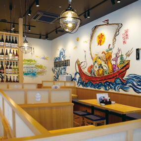 『スシロー』と同グループである大衆寿司居酒屋が四国初出店!仕入れ力を活かし、こだわりの寿司や一品料理をお手頃価格で提供。「ねぎまぐろとオリーブオイルの素敵すぎる出逢い。」などの思わずクスッと笑えるようなネーミングもここならでは。店内は明るく、ボックス席が多いため家族にもおすすめ。全80種類以上のメニューがあるので酒と肴のマリアージュを探してみては。