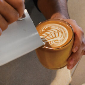 美味しい一杯はここから始まると言っても過言ではないほど大切な「焙煎」。kokiさんがこだわりと愛情を持って、焙煎している。口当たりなめらかなカフェラテ。ラテアートも繊細で美しい!