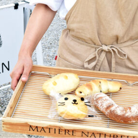 庵治町にベーカリーがOPEN!猫好きの店主が、猫のしっぽを小麦の穂で描いたイラストの看板が目印。前日から時間をかけてこねた生地で丁寧に焼き上げたパンは、常時15種類ほどが開店と同時に並ぶ。