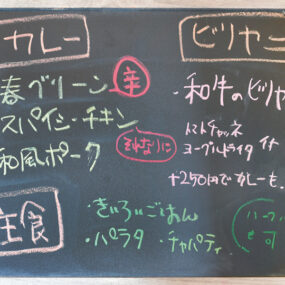 カレーやビリヤニの内容は 日替わり。店内にある黒板をCheckして。