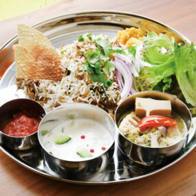 ナッツやパクチーをトッピングしたビリヤニに、サラダやパパド(煎餅)、野菜のピクルスがのったプレート。+250円でお好きなカレーの追加も可能。