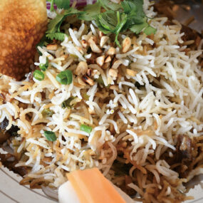 スパイスが効いた肉や魚をバスマティライスと炊き込んだインド風の炊き込みご飯のこと。食材の旨みを吸収したバスマティライスはフワッとパラッと軽い食感がクセになる。