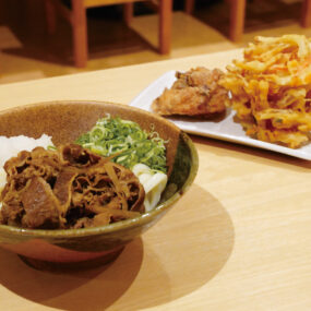 「地元の方に日常食として利用してほしい」と坂出にOPEN!名物「肉ぶっかけ」は、厳選した牛肉を甘辛醤油だれでじっくりと味付けしており、うどんがススム!21時まで営業しているので仕事終わりでも寄れるのが嬉しい。