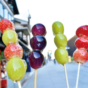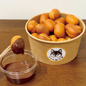 「こんぴらさん」の参道沿い、柴犬が目印のお店。看板メニューは、ふんわり焼きあげたひと口サイズの「チョコカステラ」。砂糖を使わず、カカオバターで甘みを調整したこだわりのチョコが絶品!さらに、20年以上にわたり、フルーツ飴を手掛けてきた店主が作る「タンフル」も人気。見た目も華やかで、参道散策のお供にはもちろん、イートインスペースでゆったり味わえるのも魅力。