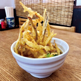 手打ちにこだわり、昔ながらの讃岐の味を提供するうどん屋。土日は県外客も訪れ、地元の人々にも愛されている。名物「ごぼ天うどん」は40年以上受け継がれた伝統の味。薄切りのごぼうをサクサクに揚げた大きな天ぷらは食べ応え抜群!