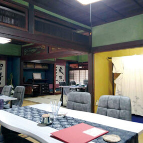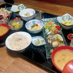 明治元年竣工の築150年以上の古民家をリノベーション。重厚な梁や欄間、障子など、当時の職人技が光る空間がそのまま活かされており、“時を旅する”ような感覚が味わえる大人のカフェとなっている。定期的に変わる着物の展示や、今は亡き書道家・大林恵蘭さんの作品も必見。料理は珍しいほうじ茶ご飯に野菜たっぷりの見た目も華やかな和御膳スタイルが楽しめる。