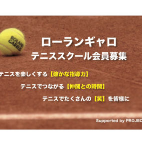 あなたのL i f e S t y l eにテニスをローランギャロと一 緒 に新しいチャレンジ!入会金 3,000円 月会費(4回8,000円/90分 6,000円/60分。経験豊富なコーチが皆様と共に楽しい時間を創り出します。