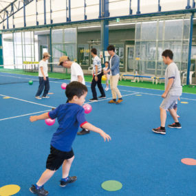 「テニスって楽しい♪」そんな気持ちが、テニスをはじめた子どもたちの心の中にすくすく育つよう、プレイアンドステイシステムを取り入れています。また、全身を使ったマット運動や器具を使ったレッスンなど、体の基礎作りやバランス感覚、運動能力の向上が期待できる体育教室も行っています。