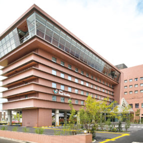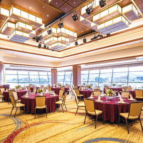 ランドマークとしても目を引く外観。駐車場は215台完備。最上階のスカイバンケットホールは、開放的な大きな窓から屋島や高松市内が一望できる。客室は階によって異なるテーマが設けられている。写真の5階は“讃岐の祭”がテーマ。